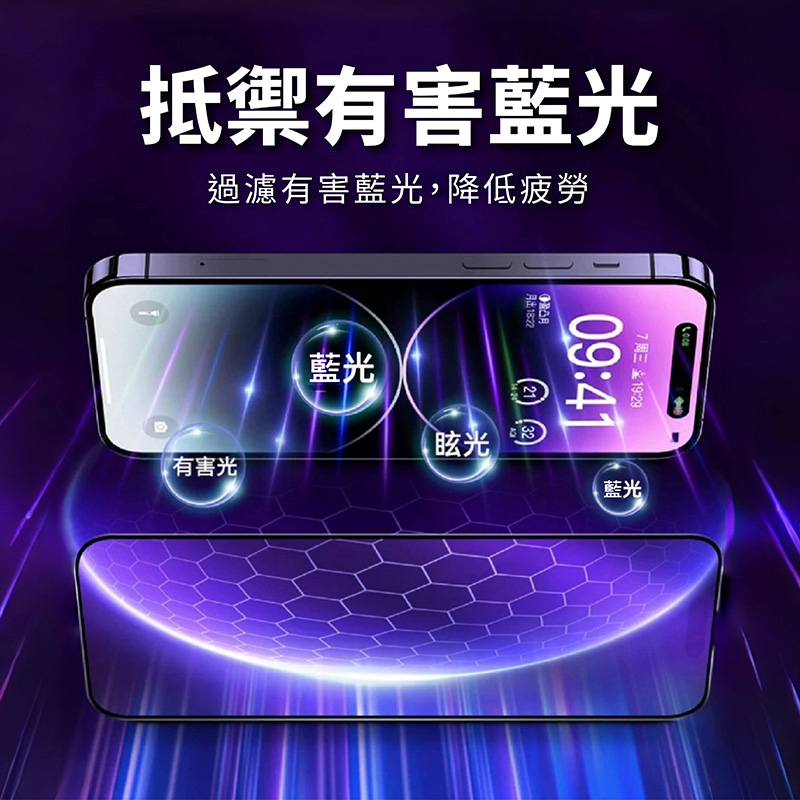 商品規格】 名稱:抗藍光保護貼 材質:0.33mm鋁矽玻璃+抗靜電AB膠+真空鍍膜塗層