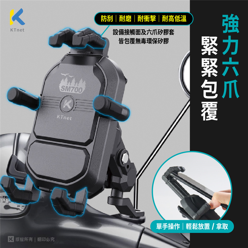 防盜/遮陽/避震器 手機機車架,後照鏡款!!! ⭕️設備接觸面及六爪矽膠套為防刮/耐磨/耐高低溫/耐衝擊的材質 ✴️特性 ✅減震裝置設計 ✅遮陽帽附加設計 ✅防盜鑰匙圈扣設計 ✅手機厚殼的最佳選擇