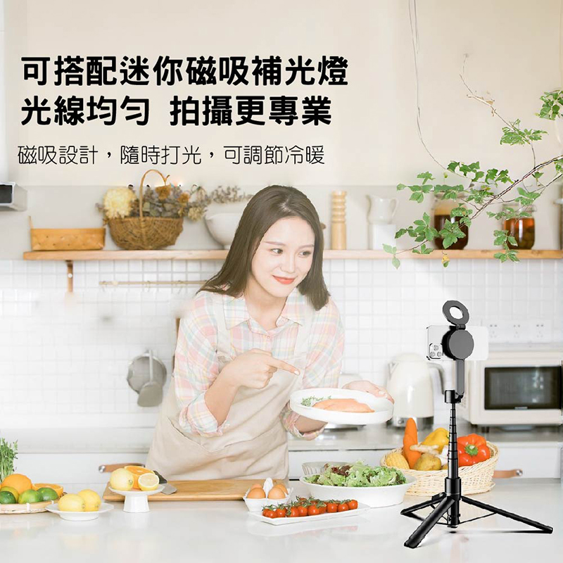 A :這支 藍芽遙控直播自拍棒 適合 居家直播、Vlog錄影、旅遊拍照、朋友聚會合照,還支援 雙面磁吸座,能同時裝上 補光燈+手機,畫面更清楚。