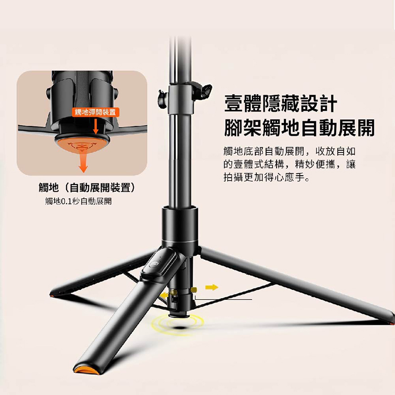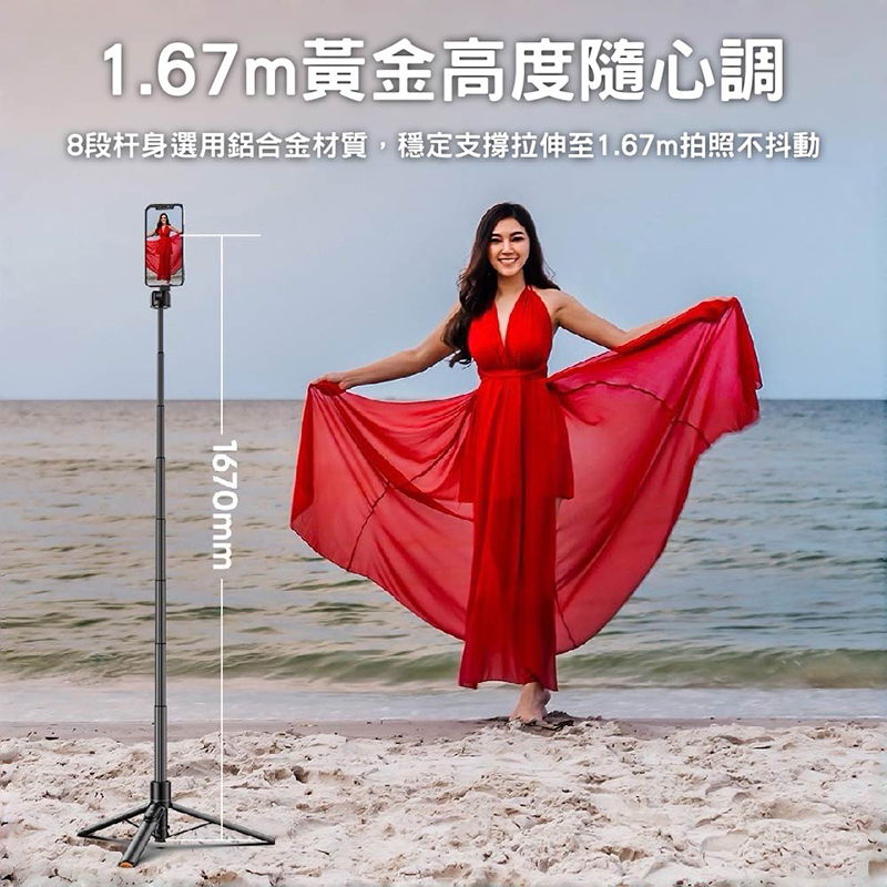 ✨ 最高可拉伸 1.67米 7段加長設計 📏,搭配 落地自動彈開三角架 📐, 不用找人幫忙也能 穩定拍攝
