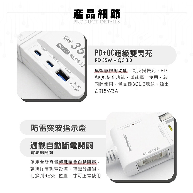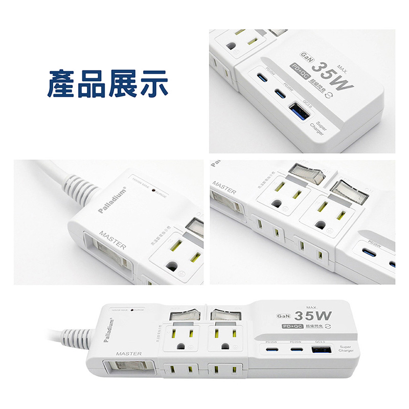 ▲ 主要成份:銅、PC塑膠 ▲ 產品規格:4口(1650W)+3口氮化鎵PD20W(Type-C)+QC3.0(Type-A)共35W