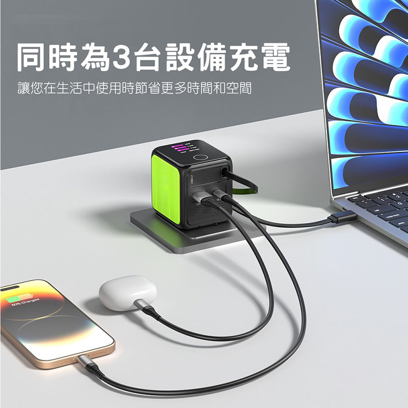 輸出設計:Type-C孔+USB-C伸縮線+USB-A口(三台同時快充)