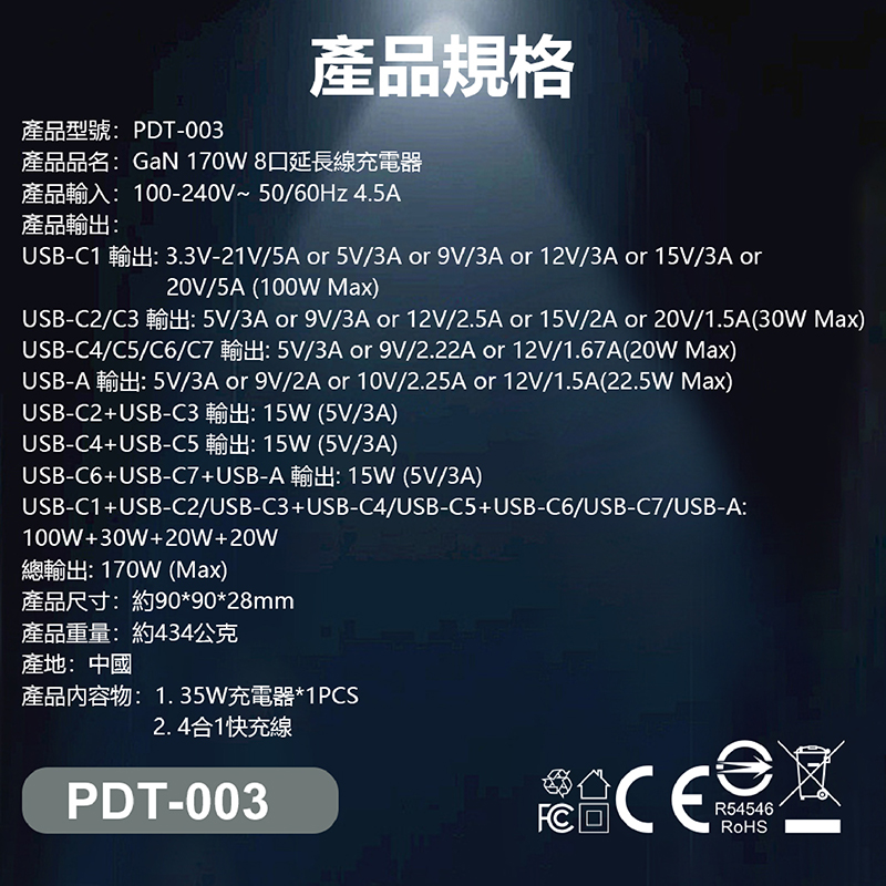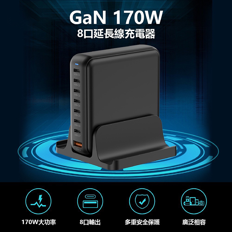 USB-A輸出:5V/3A or 9V/2A or 10V/2.25A or 12V/1.5A(22.5W Max) USB-C2+USB-C3輸出:15W (5V/3A) USB-C4+ USB-C5輸出:15W (5V/3A) USB-C6+USB-C7+USB-A輸出:15W (5V/3A) USB-C1 + USB-C2/USB-C3 + USB-C4/USB-C5 + USB-C6/USB-C7/USB-A:100W+ 30W+ 20W+ 20W
